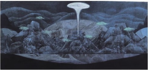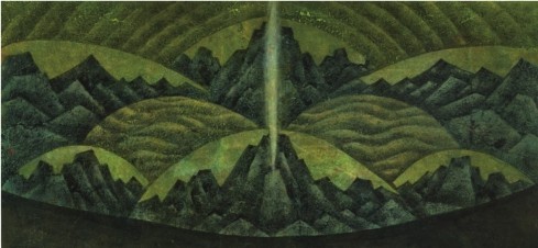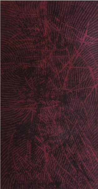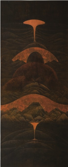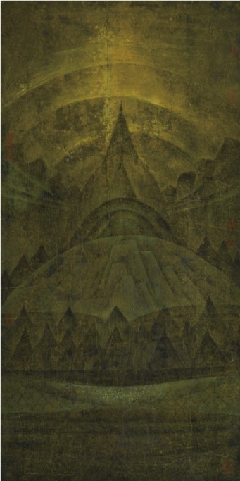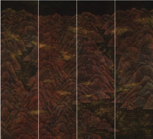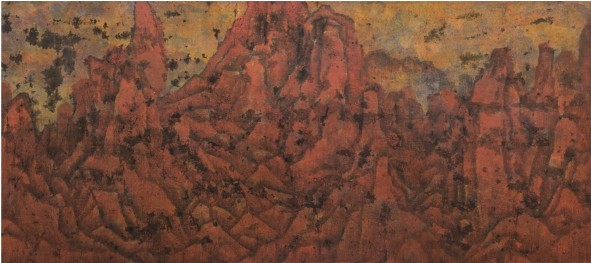 《云梦系列——瑞云浓》以大面积的暗红色调与几何化的造型描绘群山,可谓“密不容针”,以黑色作为背景,复以褐色勾画河水,三者构成明暗和冷暖的对比,几抹黄色光柱映照于群山之中,中国山水画特有的积墨、积色与西画的光影于此完美无瑕地统一在一起,令观者不禁叹为观止。