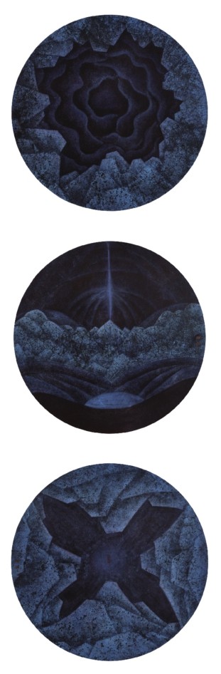 《大自在系列——赋幽兰》以传统团扇的形式描画幽兰和群山,兰花或绽放或隐匿于群山中心,观者在此感受到了时空的反转、历史与当下的交辉。兰花与群山均以工笔的形式予以刻画,三个由层层积墨、积色而绘就的团扇宛如三个月亮并置悬挂在宇宙之巅,让人肃然起敬,一种庄严、静谧、清逸的美感油然而生,这和实验水墨之父刘国松的某些作品具有异曲同工之妙。