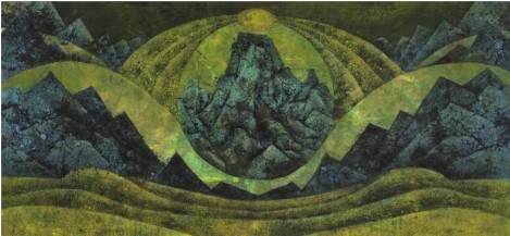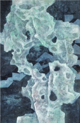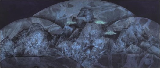 总之,李圩先生立足于积墨和积色法,在借鉴米芾、龚贤、黄宾虹、李可染、贾又福、刘国松等艺术名家成就的基础上,将传统山水画的疆域予以扩大,尝试通过新的积墨法和积色法达到类似版画、壁画甚至浮雕的审美效果,他把设计和工艺理念与传统山水画语言进行融合,从而成为“跨界型”山水画家,因此从这个意义上说,李圩老师形成突破传统、不拘一格的个性化“李氏山水”体系,其主旨就表现为“墨润色苍”“浑厚华滋”。李圩先生立足于积墨和积色法,以隐喻的方式,对传统儒释道乃至西方当代生态美学思想进行了诗意的表达与形象化的阐释。他赓续传统,勇于探索,为中国山水画的现代转型与当代建构作出个性化贡献,其将版画、唐卡、敦煌壁画甚至浮雕乃至设计等造型因素与传统山水画予以整合,把中国山水画的工笔性与写意感进行融汇,可谓贯通古今,横亘中外,从而形成卓尔不群的观念山水画与心象风景,成为当代山水画坛的杰出代表。