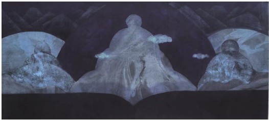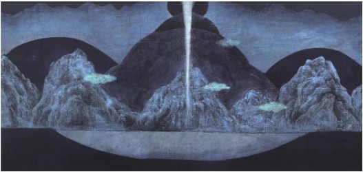 李圩笔下的月光伫立于云彩和群山的正上方,处于画面的中心位置,它高耸于云端,直冲霄汉,皎洁的月色倾泻而下,天地合一,仿佛为群山注入无穷的力量。该作采用平远的构图,云彩、群山均被抽象化和几何化,斑驳浓密的皴法形成历史的沧桑感,光月以及漂浮的六朵云彩产生缥缈的光感,进一步增加画面的神秘气氛。中西两种绘画理念也于此密切地交织在一起。