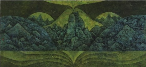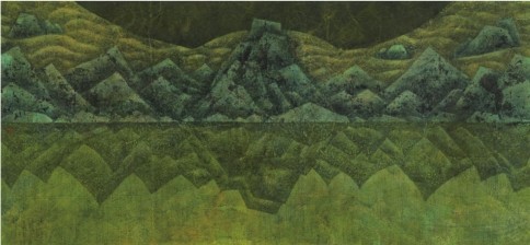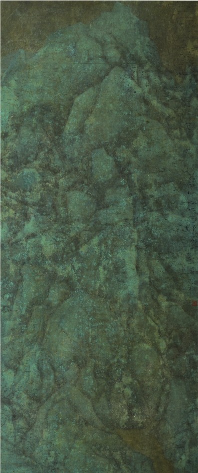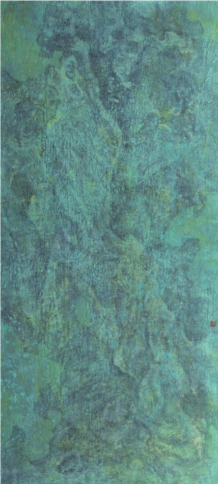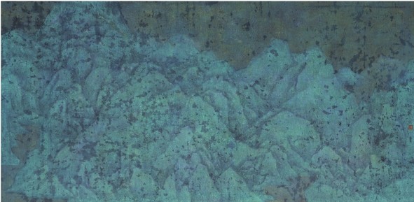 《云梦系列——清平乐》虽然分为四个部分,但却是一个整体。此作仍以青绿为主色调,山体还是以梯形和三角形勾画而成,斑驳的肌理增强了山体的沧桑感,碧绿的河水形成正负形的变化,既起到切割画面结构的作用,又强化了山脉的幽深感和空间性,《清平乐》原为唐教坊曲名,后用作词牌名,始兴于唐代,流行于宋代,为宋词常用词牌,这一方面表明作者“何必丝与竹,山水有清音”的诗画一体的审美理想,另一方面也寄托了画家对于唐宋绘画的敬仰与推崇之情。