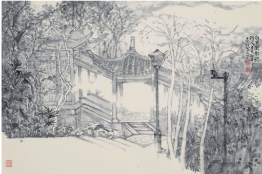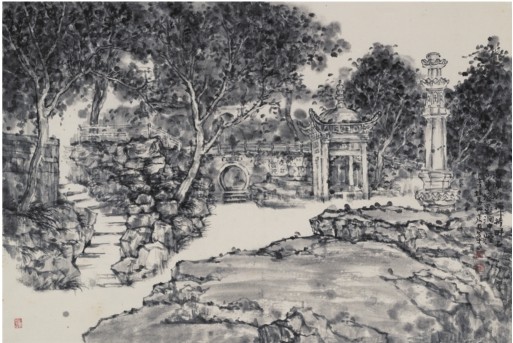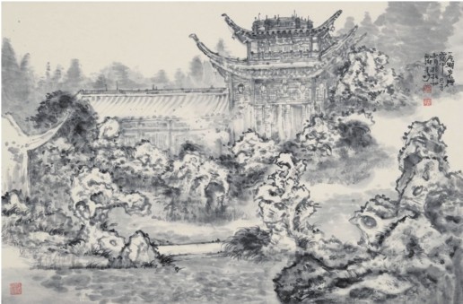 李圩的山水画首先借鉴了传统的积墨法。用墨,是中国山水画公认的难题。其中,积墨法是中国山水画科目中十分重要的用墨技法之一,在山水画的发展历史中有着举足轻重的地位。积墨法,即层层加墨,施墨由淡而浓、逐渐渍染的用墨方法,这种技法往往使物象具有苍辣厚重的立体感与质量感。