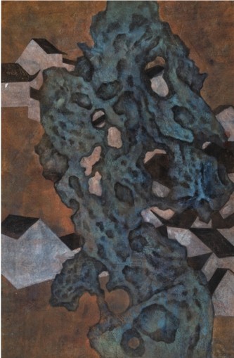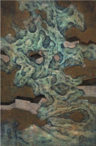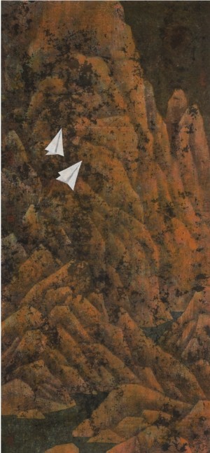《玲珑引系列——簇彩锦》以反复的积墨、积色形成正负空间,与英国雕塑家亨利·摩尔的雕塑有异曲同工之妙。虽名之为“簇彩锦”,但其造型仍然来自“假山石”,尤其是三只银白色“纸飞机”的介入与黄褐色“假山石”形成写意与工笔的对照,唤起人们心中童年的乐趣。该作打破传统中国画的留白,代之以浅绛的背景色,并由此形成平面化与立体感的对比,中西绘画在此殊途同归。