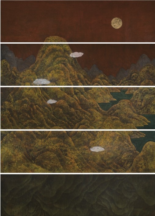 《云梦系列——柳垂金》以金碧山水画技法描绘山体,此画中的山脉不再使用几何化抽象形式,而代之以具象的刻画,同时以较为热烈的红色作为背景色,二者互为依托,一轮金黄的明月高悬空中,映衬于群山之上,愈显金碧辉煌之境。四朵云彩漂浮其中,更添澄明之感,两湾碧绿湖水萦绕于山体之间,与山体形成冷暖明暗的对比,《柳垂金》是宋代词人仲殊所作之词,词曰:“中春天气禁烟暖,海岳灵辉储庆远……永算金尊屡满,酒里千年春烂漫。”作者借仲殊的词意,表达“晴空一镜悬明月,碧水满池映银钩”的美好意境,可谓诗画合璧,锦上添花。