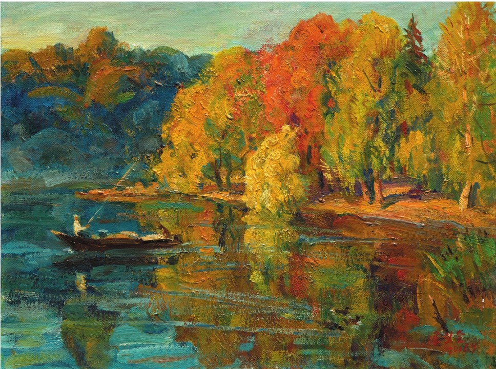 《秋日》分为上下两个部分。上半部以浓艳的色彩描绘起伏的远山和茂密的树林。远山以蓝色调为主,茂林以黄色调为主,二者形成冷暖与明暗的对比;下半部刻画一位垂钓者正坐在小船上钓鱼,河水碧蓝疏阔,河水反射出树木、小船、垂钓者的倒影,两者构成正负形的对应。整幅作品充满了强烈的表现性与写意感,虽为风景油画,但是颇有中国泼墨泼彩山水画的笔法与意境,作者用色酣畅淋漓,笔触自然散脱,色彩丰富斑驳,颇具北宋画家郭熙在《林泉高致》所说的“可居可游”之美感和北宋诗文革新运动领袖欧阳修提倡的“山林者之乐”之意境,在此,西洋风景画的光色美感与中国山水画的意趣双向耦合、融为一体。