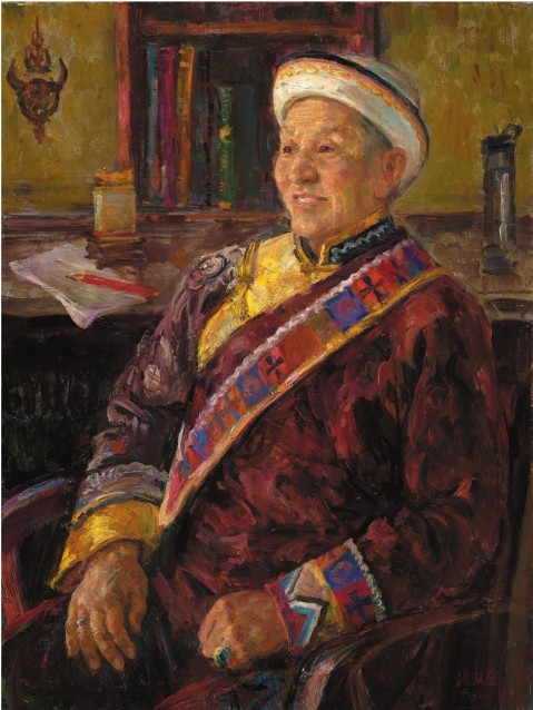 《裕固族老人》刻画甘肃省裕固族一位老妇人端坐于室内椅子上的形象。她身着色彩鲜艳、图案精美的裕固族传统服饰,华丽炫目的服装上的精美刺绣,展现了裕固族女性的勤劳与智慧。桌子上的书架和纸笔充分表现出新一代裕固族的文化内涵和书香气息。