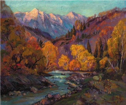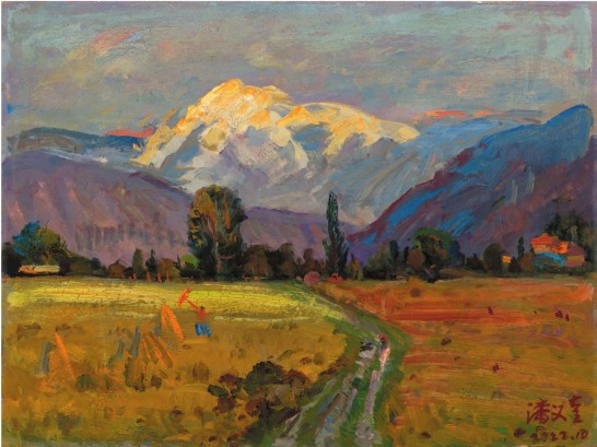 潘义奎先生笔下的风景画具有多向度的风格与意趣,既有慷慨激昂、华美壮丽、雄伟辽阔、沉郁肃穆的壮美之境(如《深秋》《塔什库尔干的风光》),也有恬淡闲适、清新自然、安谧娴静、明快妩媚的秀美之境(如《夏日》《戈里巴斯达瓦河》),正是这些多元而独特的自然风景,才构成既有审美广度亦有审美深度的丰富视觉体系图谱,从而展示出艺术家对故乡山川的热爱之情和挥之不去的眷恋,这些图像是艺术家思想、情感的艺术升华,也是艺术家心灵时空的运动轨迹使然。这些风景画通过对时空境象的描绘,在情与景高度融汇下营造出一种主客一体的艺术境界。画家通过“外师造化,中得心源”,以真善美相统一的艺术理念,在表现自然风光时,使自然美、生活美和艺术美三者达到高度的和谐共生。潘义奎将中国传统绘画中的多点透视、虚实处理、计白当黑、意象造型等美学手法与西画的焦点透视、光色效应、质感、空间有机互渗、融合,进而以独特的审美表现手法最大限度地展现出时空新境象。这些手法一方面打破了特定时空中客观物象的局限,使画家在意境构成上获得了充分的主动权;另一方面也给欣赏者提供了广阔的想象天地,使作品中的有限空间和形象蕴含的无限大千世界、丰富思想内容有机统一,从而创作出将无限表现为有限、百里之势浓缩于咫尺之间的艺术意境;而欣赏者也是从有限窥视到无限,于咫尺间体味到百里之势,真正读懂艺术作品中的意境之美。意境就是画家用所表现形象来表达胸中之所思、所想、所爱,艺术家把对山水的情感倾注于笔端,让观者欣赏到作品中对自然万物的敬畏之心和其中的丰富内涵。