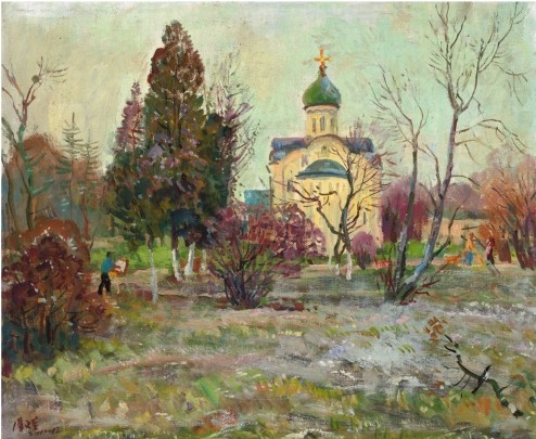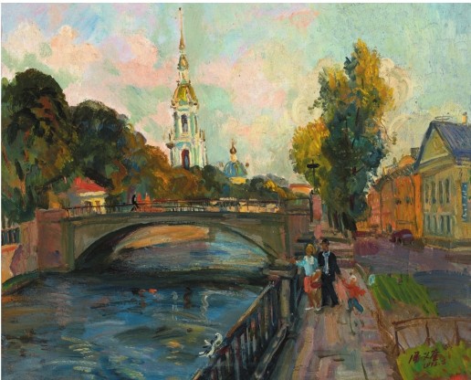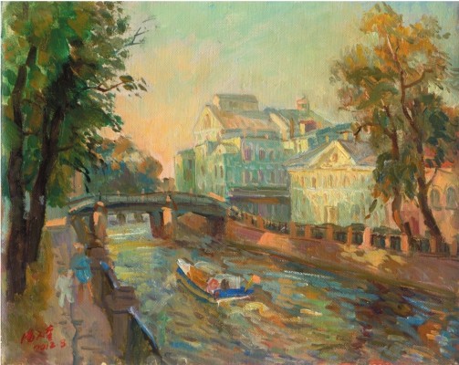 俄罗斯深厚的艺术底蕴,尤其是以利维坦、列宾、普拉斯托夫为代表的一批批杰出的艺术大师以及俄罗斯国立师范大学的优秀教师对潘义奎的艺术创作有着极大的影响,他的《俄罗斯女大学生》《玛莎》《圣彼得堡风光》《诺夫哥罗德的教堂》等画作就是对这些大师的作品予以借鉴的结晶。作为改革开放后第二代留学俄罗斯的代表性油画家,潘义奎曾师从俄罗斯人民艺术家瓦列里·亚历山德罗维奇·列德涅夫,其创作深刻体现出巡回画派的写实性与印象派外光写生的独特美感,他善于在画面当中通过色彩、构图、节奏等方式营造艺术冲突,将畅快自如的笔法、概括坚实的造型和丰富的色彩巧妙地融为一体,形成鲜明独特的艺术风格。