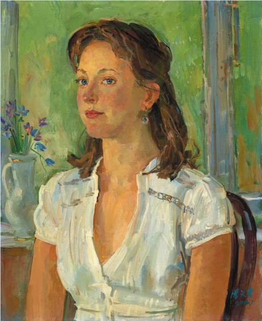 《俄罗斯女大学生》是一幅半身肖像画,女大学生容貌端庄,五官秀丽,气质脱俗,洋溢着青春的活力和妙龄少女的芬芳。画家在表现她的五官、脖颈、前胸和双臂时采用写实手法,造型精准;而飘逸的长发、白色的短袖衬衫、绿色的窗户、灰色的花瓶以及缤纷的花卉则被画家以写意的笔法绘出,西画的写实与中国画的写意在此珠联璧合地完美统一。