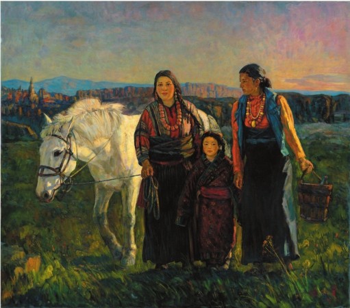 潘义奎先生的肖像油画以《打水的姑娘们》《俄罗斯女大学生》《黄昏》《玛莎》《葡萄园的小女孩》《塔吉克汉子》《裕固族老人》为代表。《打水的姑娘们》(封二)描绘西北藏族姑娘到河边打水的情景。三位姑娘的形象造型严谨,其所穿的衣服色彩艳丽,明暗相间,具有鲜明的民族特征。她们的动态各有不同,最前面的姑娘用铁瓢正在水中取水,中间的姑娘则用木桶灌水,后面的姑娘则正将木桶放到水边,尽管神态与动作各异,但每个人的脸上洋溢着幸福的笑容。尤为重要的是,画家将三个人物置于山水之间,这样就把肖像画与风景画有机统一起来,打破了二者的藩篱。风景以淡雅的色彩平涂而成,三只飞鸟在空中掠过,与三位姑娘形成呼应的关系。作品中的人物以西画的焦点透视技法画出,山水与飞鸟则以平面化的多点透视加以表现。该画既有西洋油画的光色效应,亦有中国山水画的意境与气韵,中西两种艺术精神与美学技法于此合二为一。