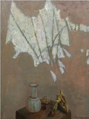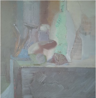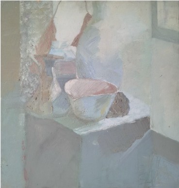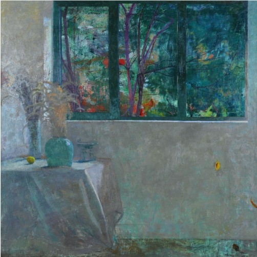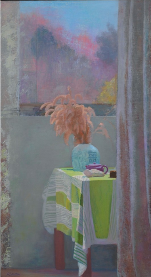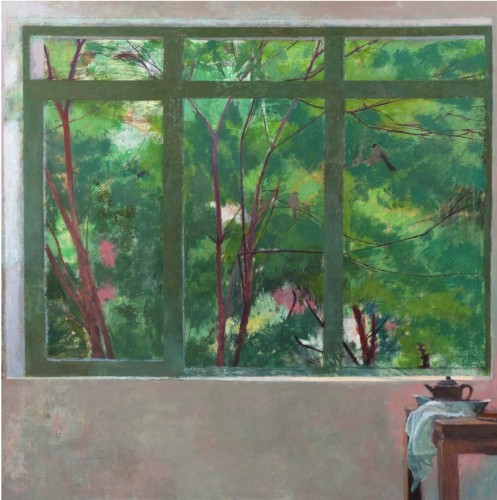 从视觉上讲,这些内容的选择只是作者的一种转借与发挥,也似乎是对城市喧嚣的舒缓与逃离。比如,油画《嘉木欣欣》的画面主体是一面窗户,窗外,碧绿如玉的树林喻示着勃勃生机,室内,右下角的桌子上放着一把茶壶,凝聚着内心的从容。窗外的鸟和室内的茶壶相互呼应,形成静谧的气氛。油画《南窗》和《嘉木欣欣》创作题材和内容相似,但是树木的绿色更加浓郁,因为室内和室外色调的反差,整体画面略带忧愁,给人以岁月静静流逝的感觉。