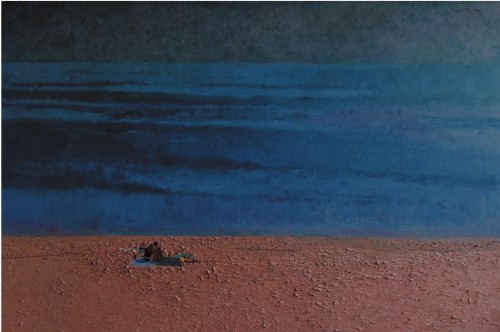 洪樑油画创作通常以内敛的方式,由内而外,从作品中的内部生长,聚集生发到外部,影响观者的情绪。因此,他的作品中多出现绿调、蓝调等冷调,看起来是偶然,其实是受内心驱动的选择。因为,冷调更容易让观者平静,与以往的记忆及经验产生联想,从而产生主观和客观的共振。比如作品《大海啊,让我慢慢地亲近你》,画面前部是相对温暖的粉色,后面色彩逐渐变冷,然后推向大海的远方。画面中的两个人物也被推进到大海的“内心”深处,让人产生无限遐想。在油画《所有的日子,只关乎我和你》中,作者将画面一分为二,天空的阴郁和大海的深蓝混为一体,形成大面积冷的色域,深赭的沙滩上一对情侣相偎相依面对大海,远观远方。在两个人的世界里,仿佛时间已经凝滞,只有两个人彼此的温暖相守。