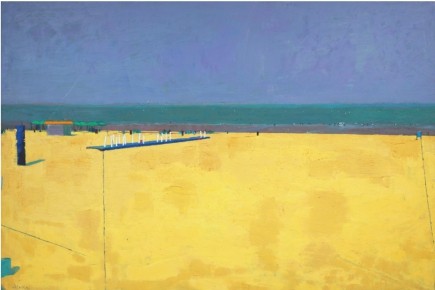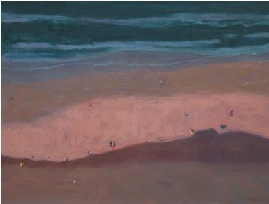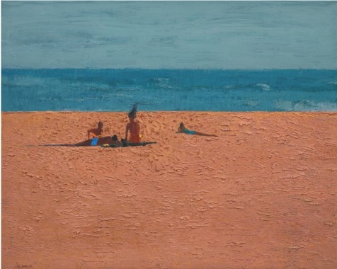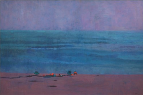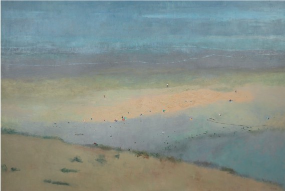 洪樑近些年创作的油画作品,多以室内的静物和大海等题材为主,内容多是由花卉、花瓶、沙滩、休闲的人组成。室内是私密空间,大海是公共空间,室内是个人身体休憩的场所,大海的辽阔和变幻,使其具有精神原乡的意义。画家创作这些题材时多以远景角度呈现,无形之中产生一种难以言说的距离感,甚至,画家是以一个旁观者的角度进行观察,似物我相望,澄怀观物。