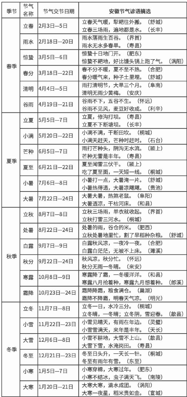 安徽横跨中国南北气候分界线,皖南、皖北在气候特点、农业生产、日常1JdKanRCejAfWXKtqYSiu+OjJt+xbiVk1GF6+pZg/ck=生活习惯等方面差别很大,由此二十四节气谚语方面也产生了相同的内容因所处地区的不同而有了不同的表达。立春是二十四节气中的第一个节气,立春过后天气转暖,各项农事活动开始,农民进人了繁忙的劳作时节。安徽宿松地区流传的谚语是“立春到农人跳”,太湖地区则是“立过春没闲人”,含山地区为“打了春赤脚奔”,虽然表述不同,但均表现了立春过后,农民又开始了一年中的紧张劳作,“跳”“奔”更凸显了这种节气不等人的急切感。