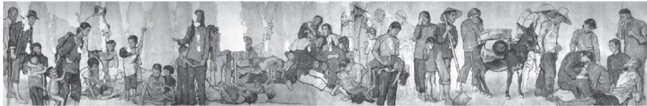 当画中那些代表父母、子女或者兄弟姐妹的流民形象出现在眼前时,观者的共情感就会被瞬间激发出来,这使得画作的感染力比任何空泛的口号都要强大,由此艺术完成了一次重要的心理转化。反复出现的流民符号,逐渐形成了一种超越地域、阶层而存在的集体记忆,就像黏合剂一样,把千千万万的个体命运和内在意识凝聚成牢固的共同体。它们不但是记录民族苦难的历史,更成为塑造风雨同舟、共赴国难的现代民族认同最深刻、最有力的视觉基础,依靠血缘共情的形象设计,成功唤醒了观者的集体记忆,依靠不断重复强化的视觉符号,使艺术完成了从审美表达到价值建构的升华,完成了从个人情感到民族精神的转化。