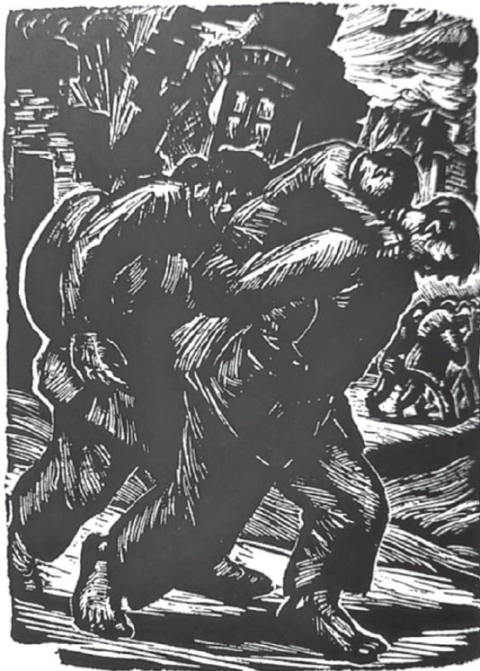 向偻的脊梁往往映射着身体与精神上的双重压迫,在艺术家笔下被赋予了深刻的象征意义。郑野夫的木刻作品《谁使我们逃亡》(如图3所示)通过倾斜的构图和动态的排线,将难民句偻的身躯转化为前行的动力。艺术家借助一对行走在废墟中的夫妻形象,表现了在苦难中依然昂扬的生命力。虽然身处炮火连天的残垣断壁之中,但是他们仍然背着行囊、带着幼子,身体大幅度前倾,步伐却有着明确的方向。对于远处的同行者,作者没有细细刻画,但那略显佝偻的身躯并不是绝望的化身,而是千千万万个家庭在战火中迁徙求生的缩影,是普通人面对历史洪流时不肯低头的脊梁。最值得玩味的还是郑野夫对于构图和刀法的运用。他用富有动感的排线营造出倾斜的、有张力的画面结构,既暗示了外在环境的动荡,又加强了人物向前行进的趋势。
