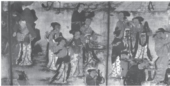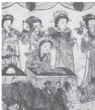 大同金代徐龟墓位于山西大同站东小桥街。[5]据石棺上刻的铭文记载,墓主人徐龟为“天德”人,兵祸之后隐居于“云中”,也就是现在的大同。在墓室的西壁有一幅名为《散乐侍酒图》(如图1所示)的壁画,画中有多位女性奏乐人员,乐器组合包括竿篥、横笛、拍板和轧筝。