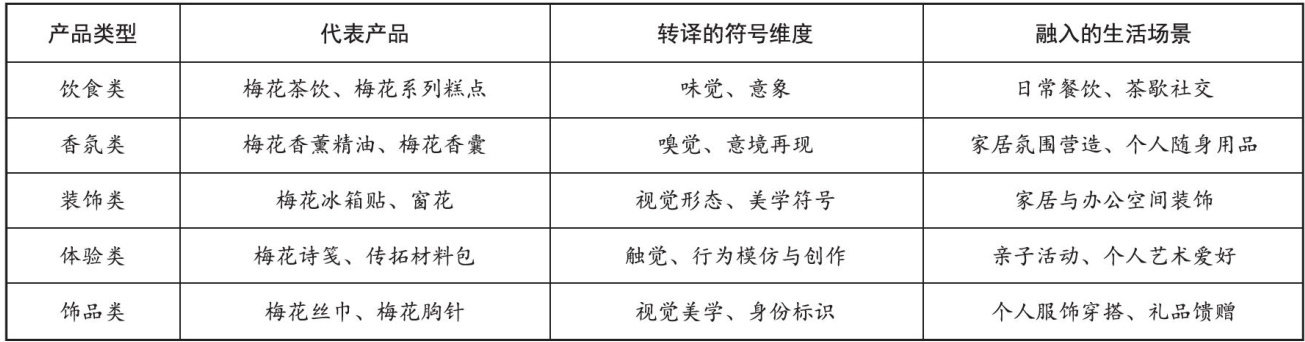 第一,产品体系的符号化开发。杜甫草堂已构建起一个覆盖形、色、香、味、意多个感知维度的梅花主题文创产品体系(见表1)。每一类产品都是对梅花文化符号某一方面特质的提取与创造性转化。