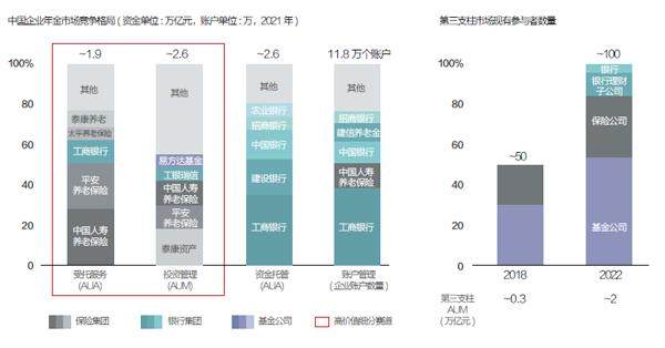 2018年,第三支柱规模仅为0.3万亿元,参与者约50家,主要由公募基金和险企组成。随着市场提速,截至2022年底,第三支柱市场规模已达到2万亿元,且参与者增加至近100家,包括公募基金、险企、银行及其理财子公司,竞争形态持续迭代,市场领导者有待确立。