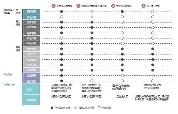 “养老生态整合者”:完整的、横跨养老金和养老服务配套的综合业务提供商,利用现有不同领域、业态的子公司布局养老产业链上的绝大多数细分领域;典型玩家主要为大型保险集团。