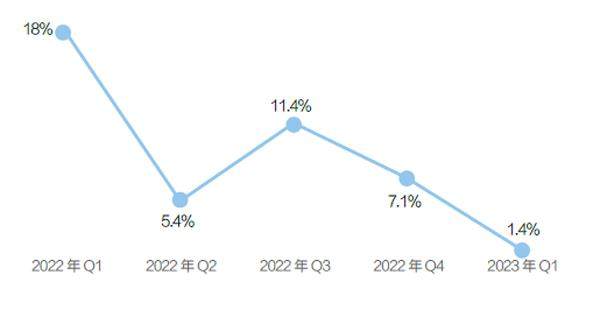 5月11日,京东发布2023年一季度业绩,收入为2430亿元,同比增加1.4%,增速下降。2022年四个季度,其收入增速分别为18%、5.4%、11.4%、7.1%。