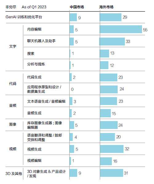 中国GenAI垂直应用领域主要聚焦文本、图像和音视频生成,海外市场则在上述领域以外出现了大量基于GenAI的开发平台、数据分析平台及代码编写平台,其原因在于海外以早期程序语言(如COBOL)编写的系统较多,许多企业面临较高编程人力成本,因此对编程辅助软件有较高需求。