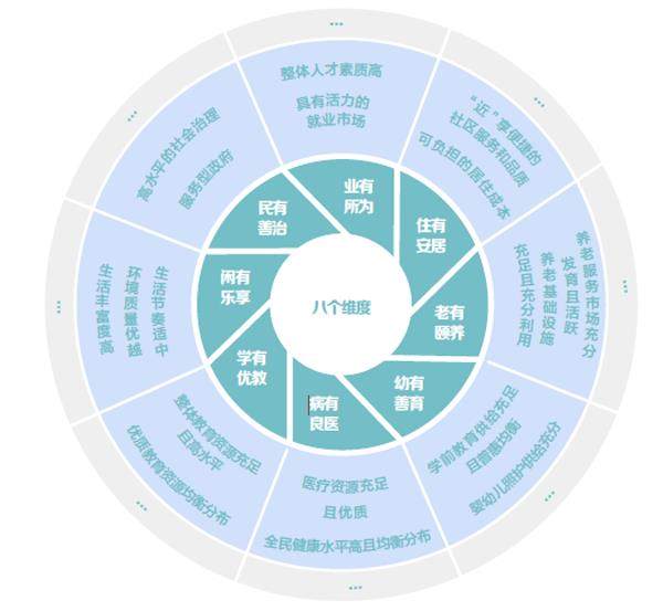 综合《中国美好生活城市榜单》评选标准、世界经合组织的美好生活指数系统标准等权威解读,一套国际国内公认的品质生活全景图,大体上涵盖品质生活的八大价值主张: 业有所为、住有安居、老有颐养、幼有善育、病有良医、学有优教、闲有乐享、民有善治。