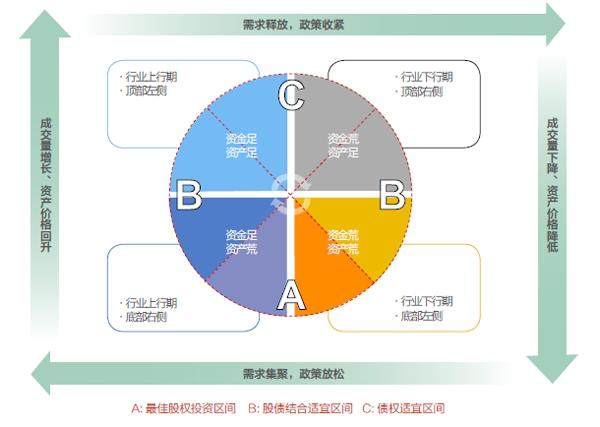 不难发现,在周期底部两侧,资产价格最低,持有股权预期收益率相对较高,股权是最优选择;在周期顶部两侧,资产价格最高,持有股权预期收益率有限,且不确定性高,此时持有固定收益的债权是最优选择;除两者之外的阶段,可以视情况采取股债结合的投资形式。