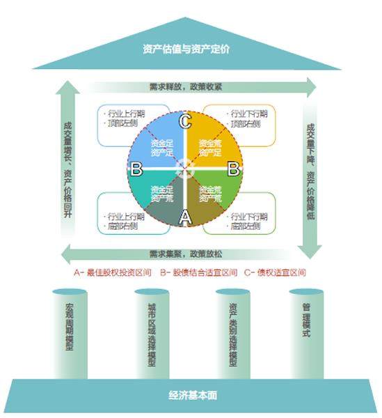 如下图所示,市场变化与政策组合推动行业周期轮动,形成权益、固收及其组合的适宜投资区间;资产要素和资金要素的供求关系变化,决定资金风险偏好程度和资本价格中枢,指导投资标的选择和资本定价。