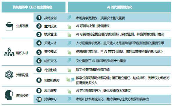 在AI赋能下,CEO的功能角色也将发生转变。传统组织中CEO的主要角色有业务发展、组织人才、外部沟通和自我投资四大类,其中部分角色在AI赋能下可以简化,而部分角色在AI时代的重要性显著提升(参见图2)。