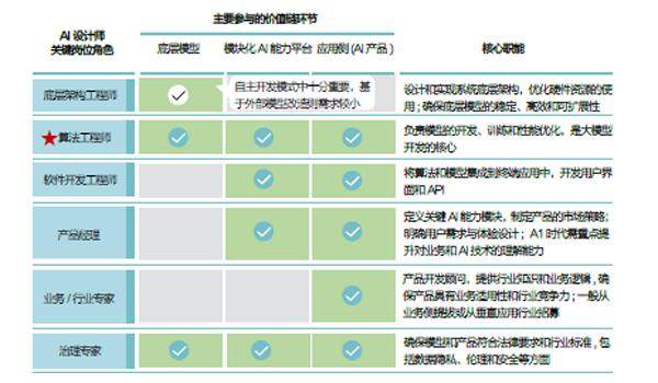 AI设计师——技术与业务复合型人才:负责搭建底层模型、模块化AI能力平台,并结合特定用例设计AI产品与工具。AI设计师有六个关键角色,其中以算法工程师为核心,多为中层人才(参见图4)。AI组织在转型阶段对此类人才需求量大,到成熟阶段因部分人才可硅基化,对碳基人的需求量会回归中等水平。