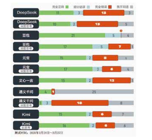 其中,豆包最准确,文心一言出错最多,通义千问最常拒绝回答。大部分AI依然会自信提供错误答案。