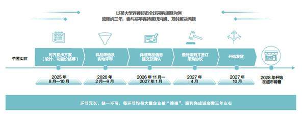 大型连锁超市门槛高,从对接到入驻周期长达三年,需明确产品优势,并与大型连锁超市各相关部门密切沟通。大批中国传统外贸企业受限于流程复杂、缺乏操作经验,未能成功进入。